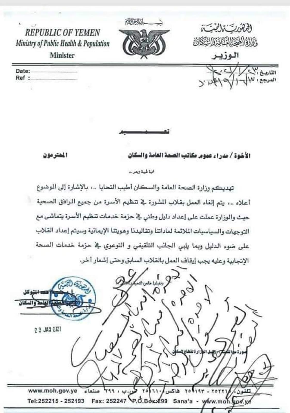 ويلزم التعميم الصادر من وزير صحة المليشيا الحوثية، طه المتوكل، كافة مدراء مكاتب الصحة، بإلغاء العمل بما أسموه “قلاب المشورة في تنظيم الأسرة” (منع اللولب) تماشيًا لما قالته المذكرة التي حصل الموقع على نسخة منه، مع هويتهم “الإيمانية”، إلى حين إعداد “قلاب جديد” بما يلبي الجانب التثقيفي والتوعوي.